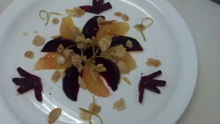 - Salada de Beterraba com supreme de laranja e amendoas douradas na manteiga e enxutas. Regado a azeite aromatizado com zester de laranja