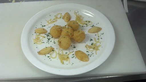 - Batata crocante torneada (Em Sete Faces) com cebola julliene caramelada